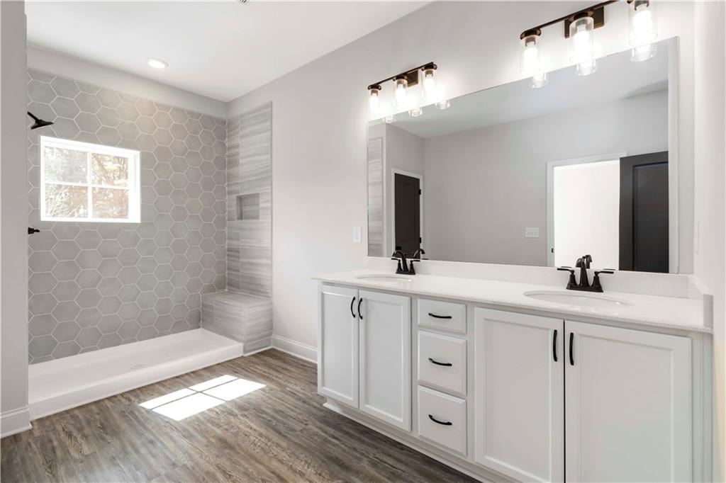 The spacious owner’s suite features a walk-in closet, quartz vanity, and a beautifully tiled shower. Upstairs, you’ll find two additional bedrooms with walk-in closets plus a full laundry room for convenience.